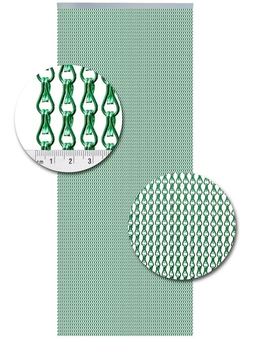 Dit zijn kwalitatief gezien echt goede vliegengordijnen. Ze zijn supersterk! De schakels zijn gemaakt van geanodiseerde draad en zijn kleur-echt. In één meter (breed) zitten 78 banen normale schakels. De groote van deze schakel is 24 mm lang en 12 mm breed. Het geheel hangt aan een zilverkleurige rail.