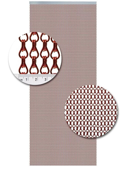 Dit zijn kwalitatief gezien echt goede vliegengordijnen. Ze zijn supersterk! De schakels zijn gemaakt van geanodiseerde draad en zijn kleur-echt. In één meter (breed) zitten 78 banen normale schakels. De groote van deze schakel is 24 mm lang en 12 mm breed. Het geheel hangt aan een zilverkleurige rail.