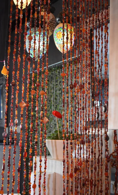 In elke deuropening creëer je een Oosterse entree met dit prachtige rood-oranje gekleurde glaskralengordijn. Het kralengordijn wordt compleet met ophangrail geleverd.