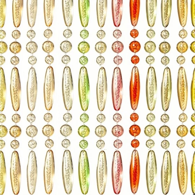 Dit zijn kwalitatief gezien echt goede kralengordijnen. De draadjes die gebruikt zijn, zijn gemaakt van nylon en dus extra sterk. De kunststof kralen zijn stuk voor stuk aan het nylon draad gesmolten. Het geheel hangt aan een witte cassette. Het is een vrij dicht kralengordijn waarbij er op circa elke centimeter een streng hangt. Om als voorbeeld even een vliegengordijn met een breedte van 90cm te noemen; hier hangen circa 90 strengen aan.