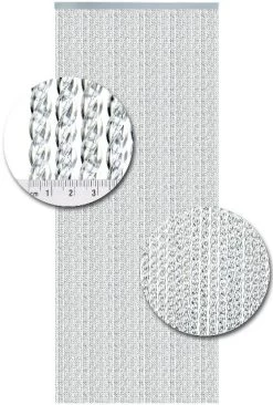 Dit zijn kwalitatief gezien echt goede kralengordijnen. De draadjes die gebruikt zijn, zijn gemaakt van nylon en dus extra sterk. De kunststof kralen zijn stuk voor stuk aan het nylon draad gesmolten. Het geheel hangt aan een witte cassette. Het is een vrij dicht kralengordijn waarbij er op circa elke centimeter een streng hangt. Om als voorbeeld even een vliegengordijn met een breedte van 90cm te noemen; hier hangen circa 90 strengen aan.