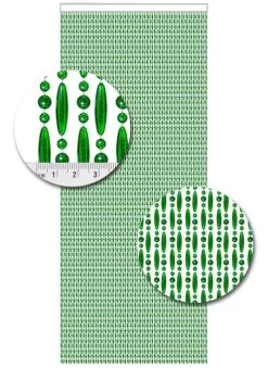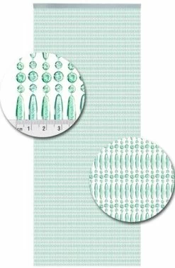 Dit zijn kwalitatief gezien echt goede kralengordijnen. De draadjes die gebruikt zijn, zijn gemaakt van nylon en dus extra sterk. De kunststof kralen zijn stuk voor stuk aan het nylon draad gesmolten. Het geheel hangt aan een witte cassette. Het is een vrij dicht kralengordijn waarbij er op circa elke centimeter een streng hangt. Om als voorbeeld even een vliegengordijn met een breedte van 90cm te noemen; hier hangen circa 90 strengen aan.