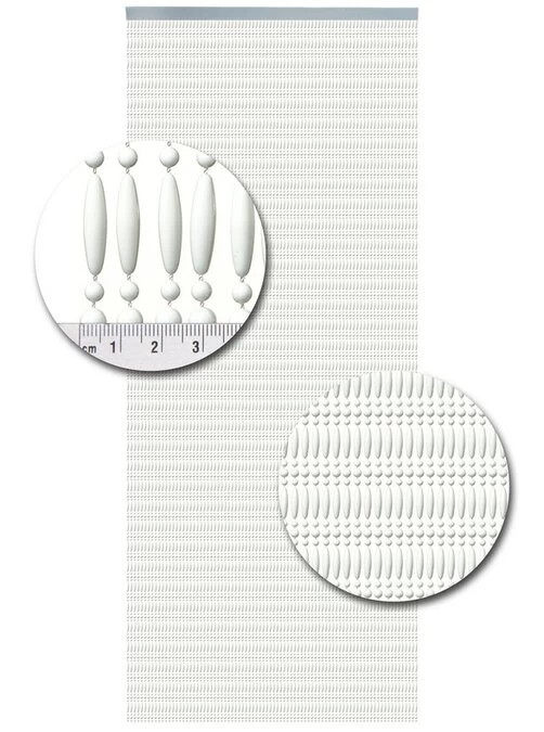 Dit zijn kwalitatief gezien echt goede kralengordijnen. De draadjes die gebruikt zijn, zijn gemaakt van nylon en dus extra sterk. De kunststof kralen zijn stuk voor stuk aan het nylon draad gesmolten. Het geheel hangt aan een witte cassette. Het is een vrij dicht kralengordijn waarbij er op circa elke centimeter een streng hangt. Om als voorbeeld even een vliegengordijn met een breedte van 90cm te noemen; hier hangen circa 90 strengen aan.