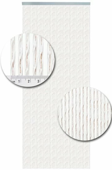 Dit luxe vliegengordijn is gemaakt van buigzaam kunststof. De strengen bestaan uit dikke ronde kunststof draden. In het kunststof zit een zilverkleurig koord verwerkt. Dit koordje zorgt ervoor dat het vliegengordijn bij warmte of kou niet gaat krimpen of uithangen. De strengen hebben een luxe, chique uitstraling en blijven niet haken zodra je naar binnen of buiten loopt. Het geheel hangt aan een brede witte ophangcassette.